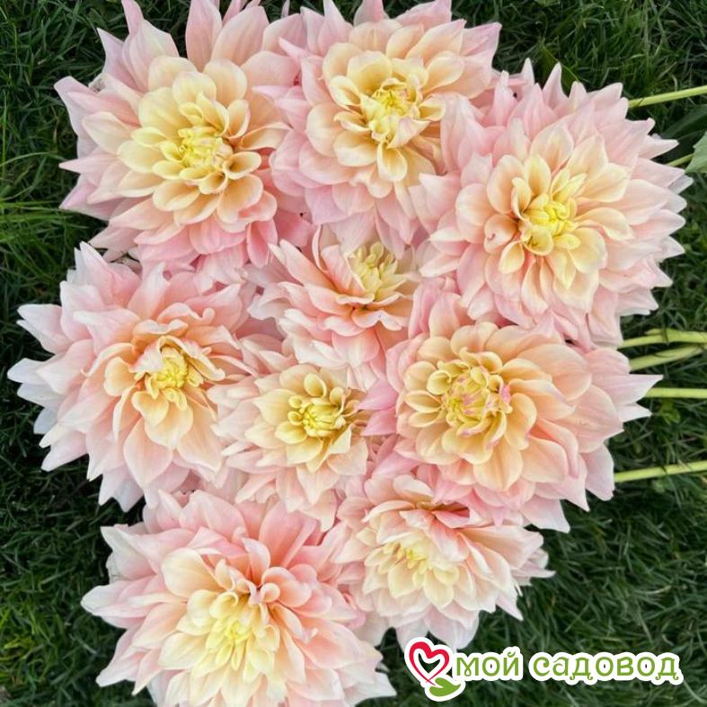 У георгины прямостоячие и прочные стебли, которые хорошо поддерживают распускающиеся цветы. В высоту они достигают 90 см. Листья насыщенно-зеленые. Они крупные, глянцевые и имеют гладкую поверхность. Основное внимание привлекают пышные соцветия. Цветки крупные, густомахровые, диаметром 25 – 30 см. Лепестки окрашены в светло-оранжевый, бело-розовый или желтый оттенок. Цветет сорт в течение всего сезона, начиная с летних месяцев и продолжая до глубокой осени.